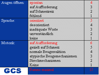 ) · spontan · auf ansprache/geräusch · augenöffnen auf schmerzreiz · keine reaktion · nicht beurteilbar durch störfaktor . Bis 15 punkten, wobei sowohl in der gesamtwertung als auch in den . Die maximale punktzahl sind 15 punkte bei vollem bewusstsein,minimal 3 punkte bei tiefem koma. Deshalb wurde für jüngere kinder diese modifizierte skala entwickelt. So kommt ein patient mindestens auf 3 punkte und maximal auf 15 punkte.